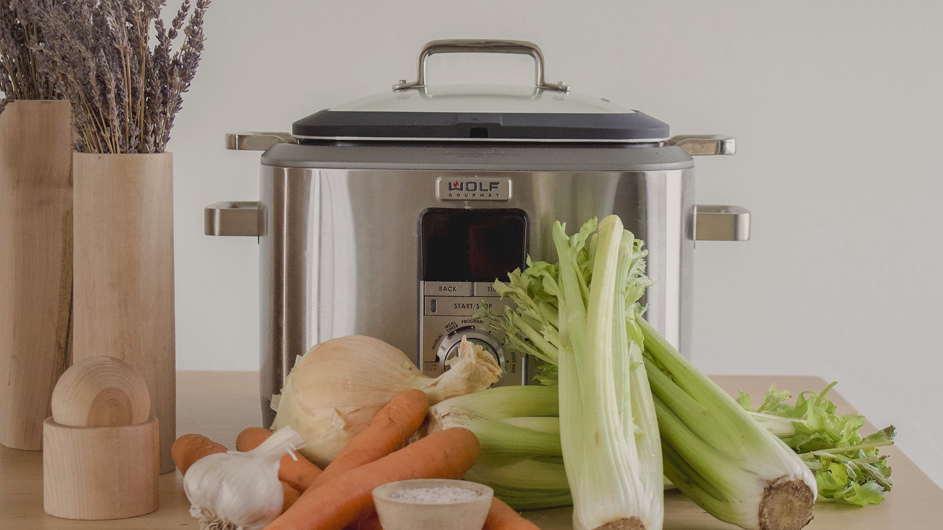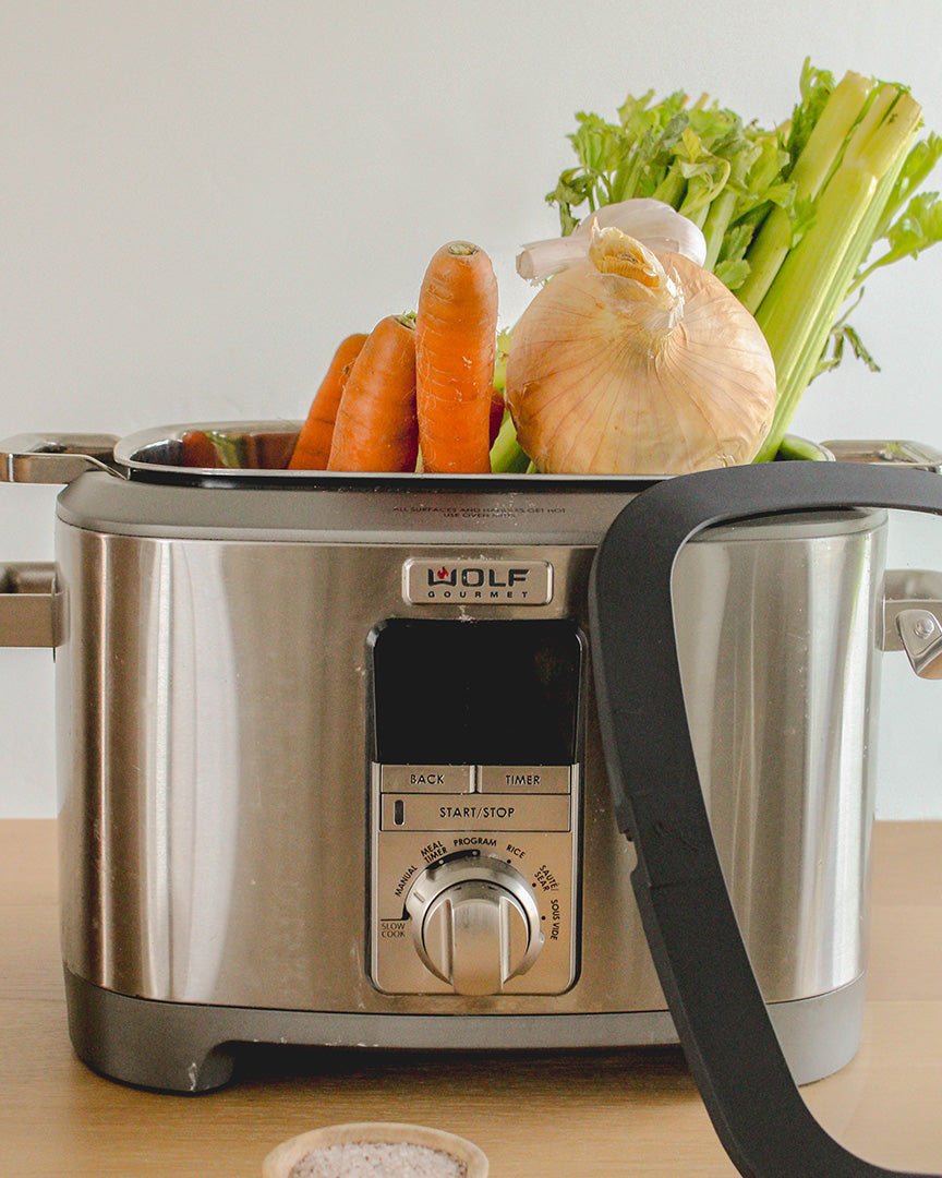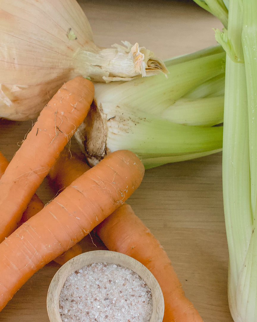| In a slow cooker, place carrots, celery, and onions. Add chicken and top with salt. Pour in apple cider vinegar and water to cover. Cook on low for 12-24 hours. Once your broth is ready, ladle into silicone ice trays and freeze to easily use in a recipe later or to simply heat and sip anytime you’d like. |