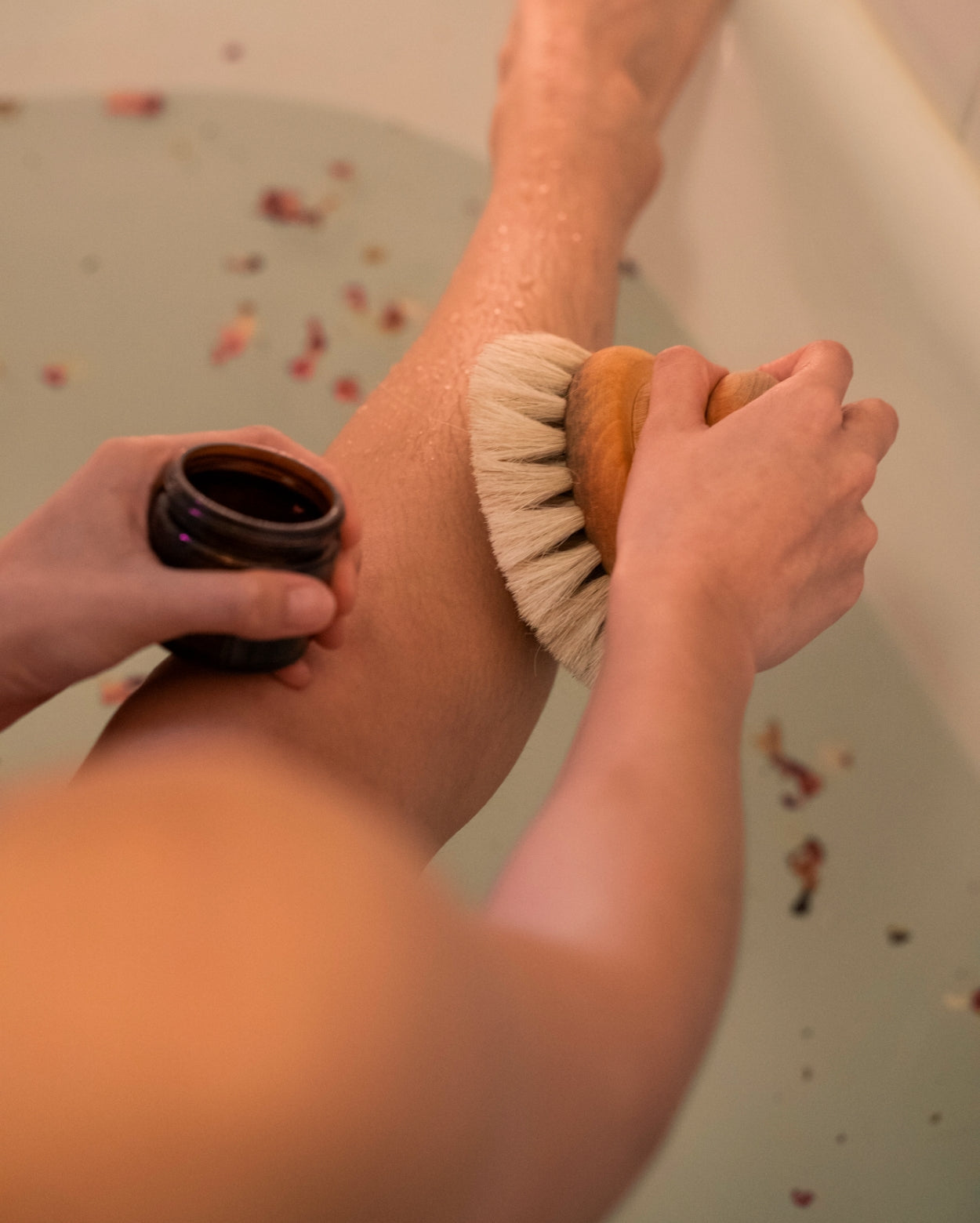 The first step to a successful shave is preparation. Before getting your skin wet, use a quality dry brush, like the Goop Ultimate Dry Brush or the Skinny Confidential Butter Brush, to help lift hair and exfoliate the skin, making the shaving process smoother and less irritating. Dry brushing is also a powerful technique for stimulating lymphatic drainage, encouraging detoxification and giving you that radiant glow.